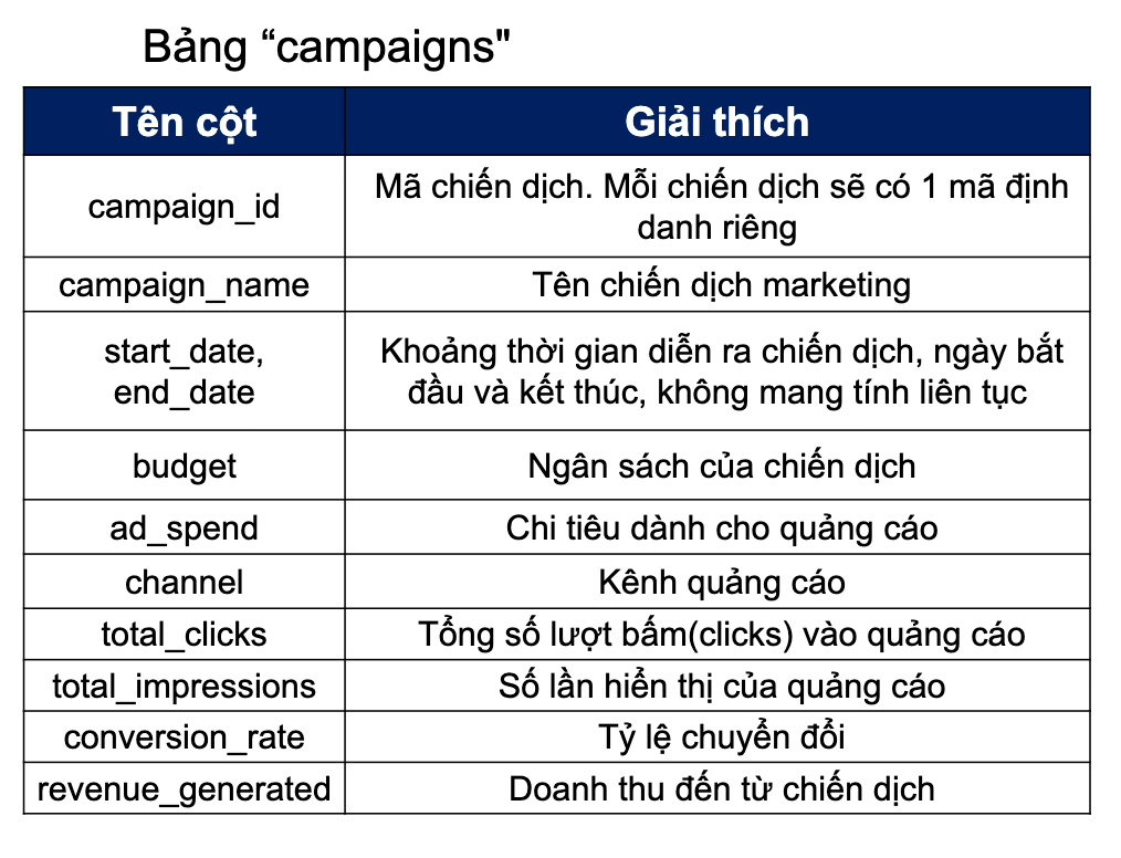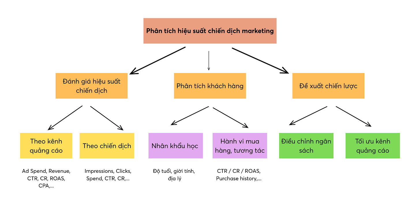 Sau phần tổng quan, mình đi sâu vào từng chiến dịch để xem kênh nào đang “ăn tiền” nhất. Đây là phần khiến mình tốn nhiều thời gian nhất vì cần vừa tổng hợp dữ liệu vừa đảm bảo cách so sánh hợp lý. Mục tiêu của phần này là xác định chiến dịch nào đang hoạt động hiệu quả nhất, từ đó đưa ra những sự điều chỉnh để tối ưu ngân sách.