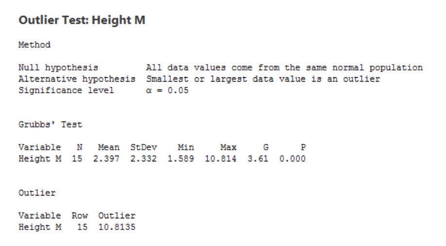 Kiểm định giả thuyết của Grubbs có p-value là 0,000. Giá trị này thấp hơn mức ý nghĩa (significance level), có thể kết luận rằng tập dữ liệu đang chứa một giá trị ngoại lai. Output chỉ ra rằng đó là giá trị đã tìm thấy trước đây.