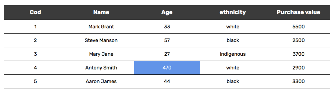 Ví dụ, cột “Tuổi” của Antony Smith có giá trị ngoại lai lên tới 470 tuổi. Giá trị chính xác có thể là 47, 70 hoặc 40 tuổi.