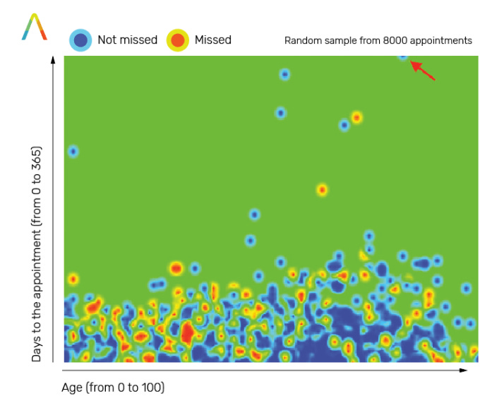 Đây là một trường hợp ngoại lệ nhất định cần được tìm hiểu, bởi vì hành vi của người phụ nữ này có thể mang lại thông tin liên quan về các biện pháp có thể được áp dụng để tăng tỷ lệ có mặt trong lịch trình. Biểu đồ dưới đây đã trực quan hóa mẫu ngẫu nhiên với 8,000 đơn vị mẫu, giúp dễ dàng nhìn ra trường hợp đặc biệt này để tìm insight.