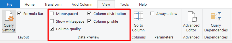 Data Profiling là công cụ cho pháp bạn hiểu hơn về tệp dữ liệu của mình. Để bật tính năng này, bạn truy cập vào Tab View và tick vào các ô như hình dưới: