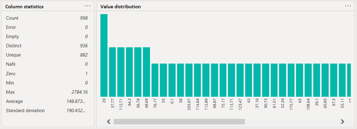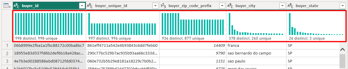 (2) Column distribution: Cho thấy sự phân bổ của dữ liệu trong các cột & số lượng giá trị riêng biệt (distinct) và duy nhất (unique). Bạn có thể phát hiện ra liệu dữ liệu có bị duplicate không nhờ tính năng này.