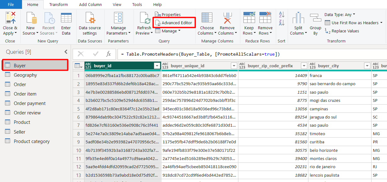 Để truy cập vào Advanced Editor, chọn bảng muốn xử lý, sau đó vào Tab Home và chọn “Advanced Editor”