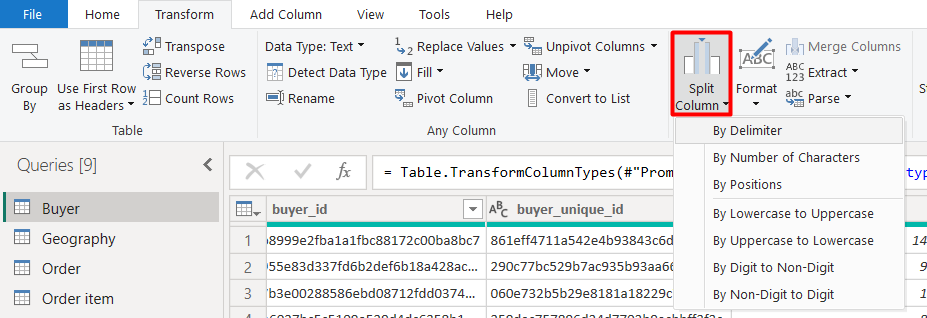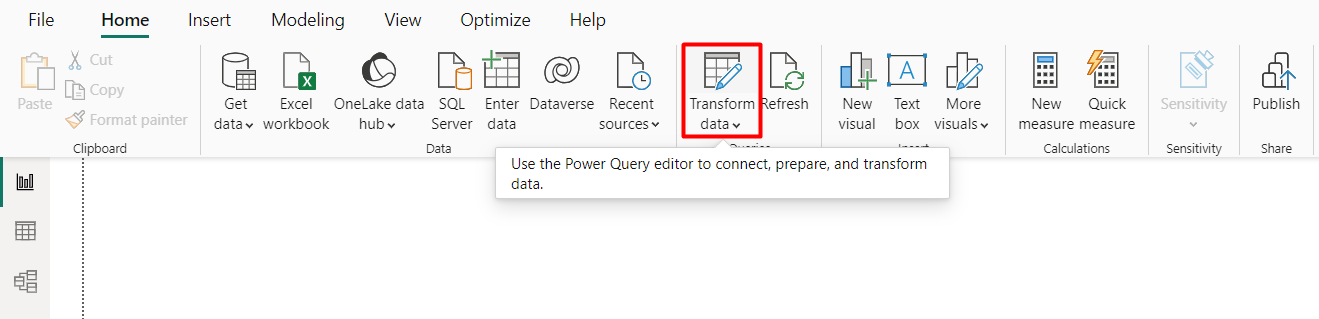 Bạn có thể truy cập vào Power Query ngay khi import dữ liệu vào Power BI, hoặc bằng cách nhấp chuột vào nút “Transform data” trong tab Home để truy cập vào Power Query.