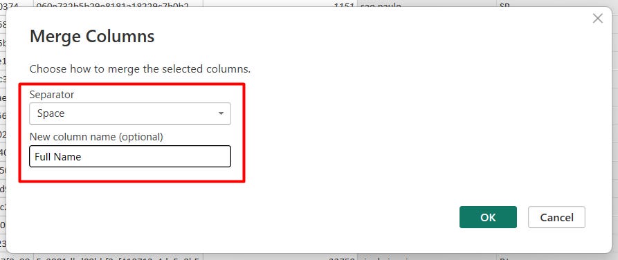 Sau đó nhập dấu để ngăn cách các ký tự khi gộp 2 cột (Separator) và tên của cột mới, và nhấn “OK” là bạn đã có 1 cột Full Name mới được gộp bởi 2 cột First Name và Last Name.