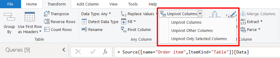 Nếu bạn muốn biến dữ liệu từ bảng một chiều thành bảng hai chiều và ngược lại, có thể sử dụng tính năng “Pivot/Unpivot Columns” trong tab Transform.