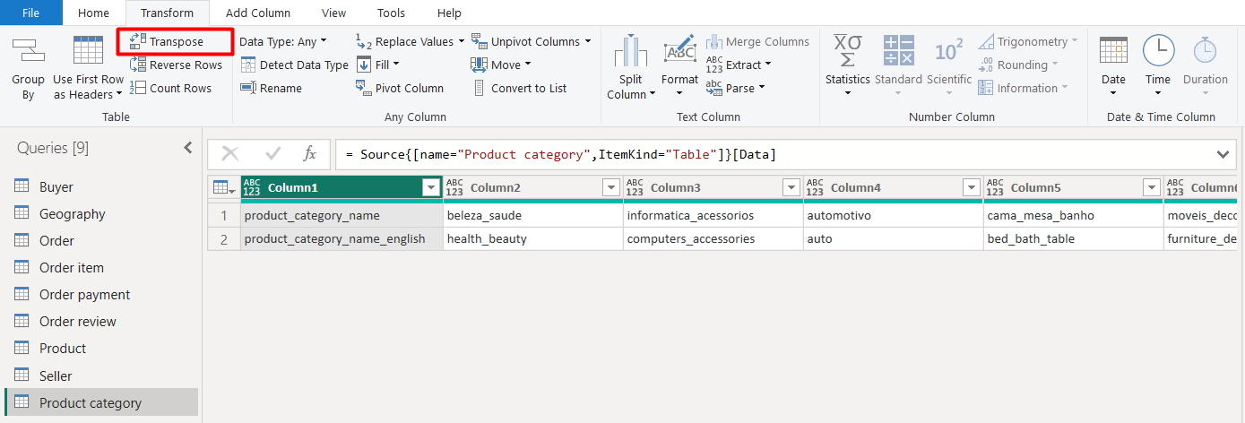Chọn bảng cần đảo chiều dữ liệu từ dòng thành cột (ở đây là bảng Product Category), vào tab Transform và chọn “Transpose”.