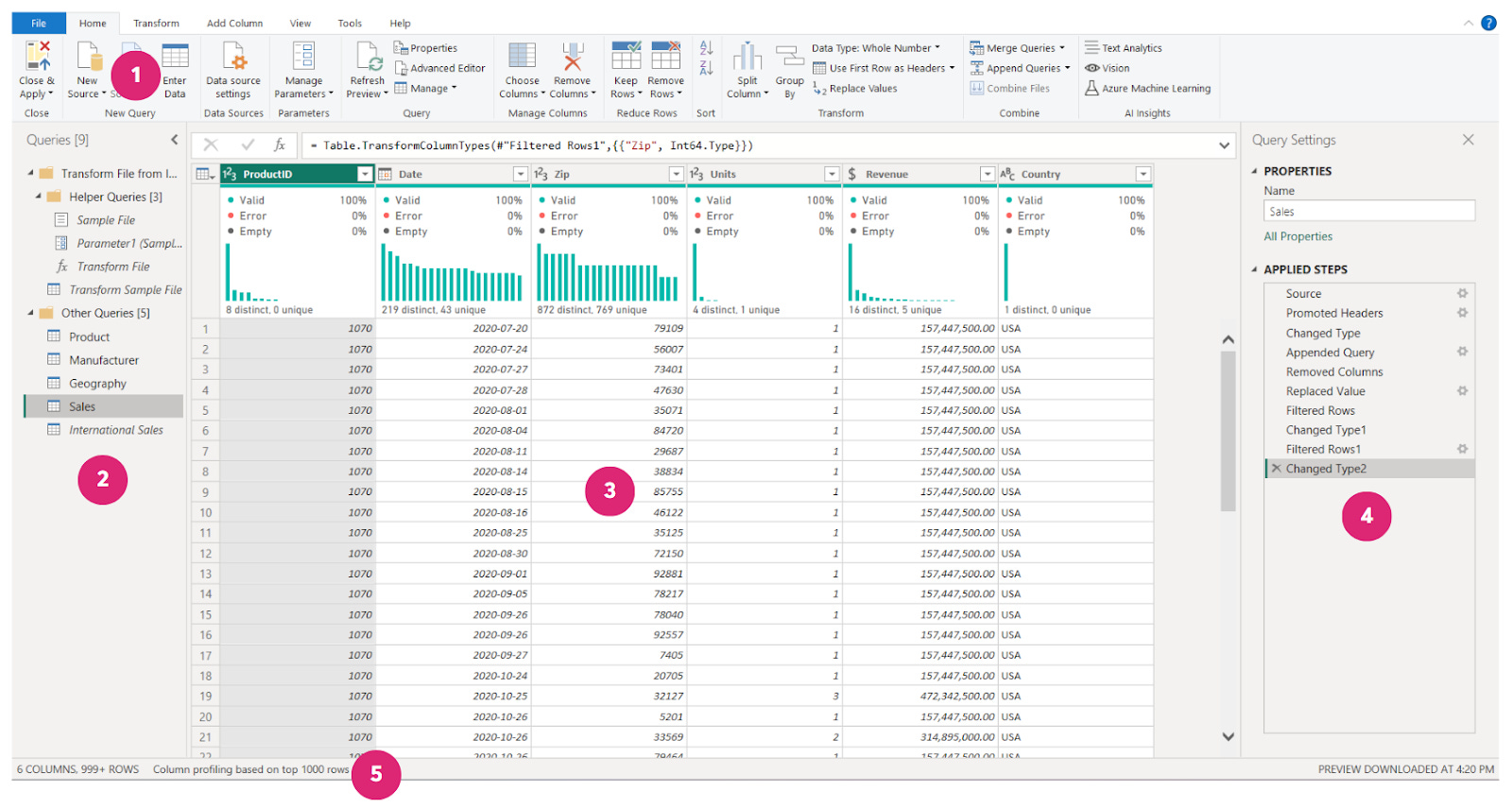 Giao diện của Power Query bao gồm 5 thành phần chính: