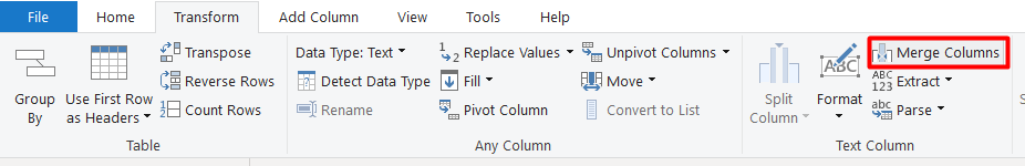 Để thực hiện Merge Columns, bạn lựa chọn cùng lúc 2 cột muốn gộp với nhau, sau đó vào Tab Transform và nhấn “Merge Columns”.