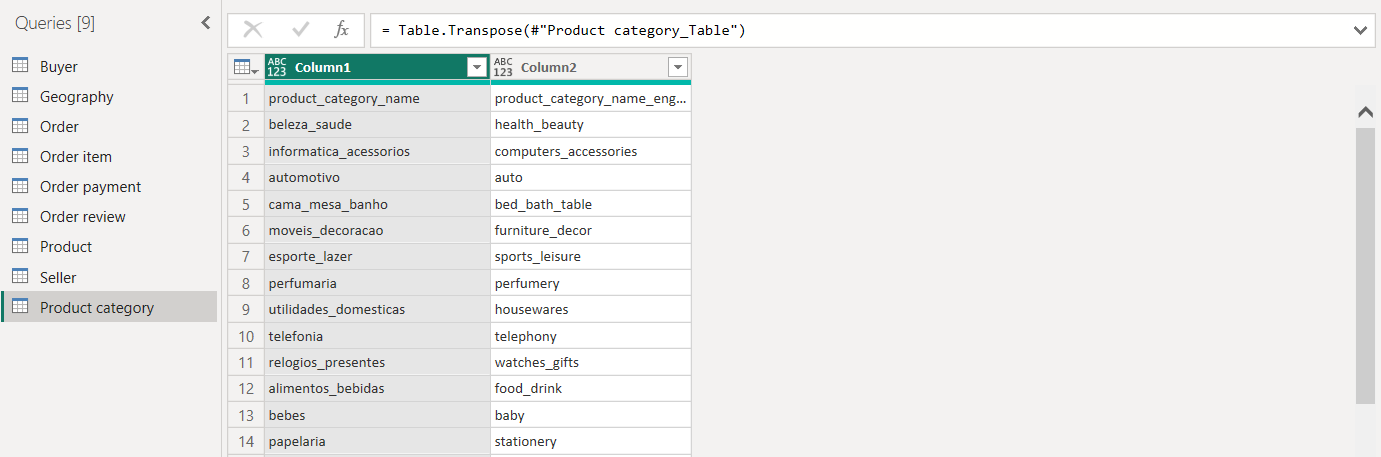 Có thể thấy bảng kết quả chưa có tên cột mà đang để mặc định là Column 1 và Column 2. Bạn sẽ cần phải biến dòng đầu tiên: product_category_name & product_category_name_english thành tên cột.