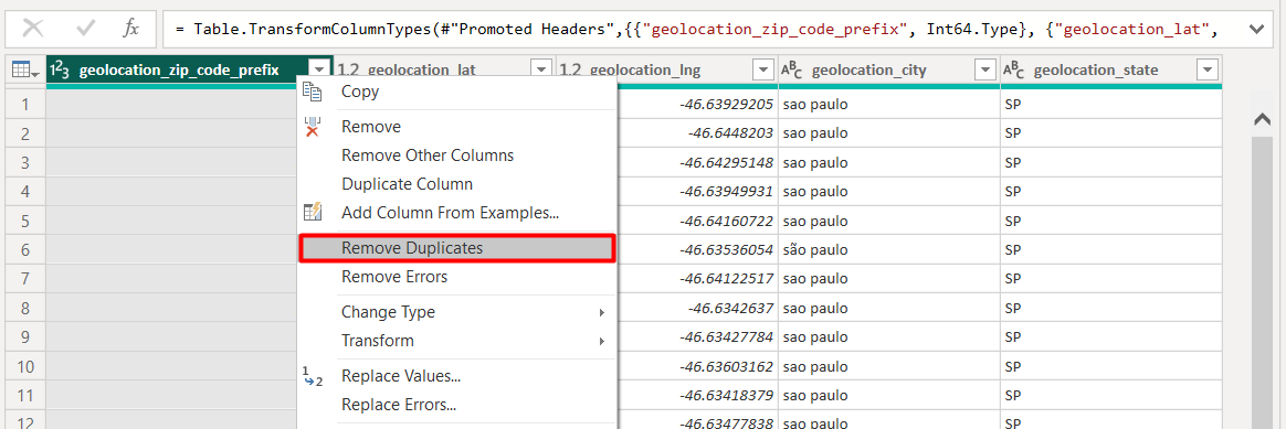 Để loại bỏ các giá trị trùng lặp, bạn click vào tên cột lựa chọn cột có chứa giá trị trùng, nhấp chuột phải, sau đó chọn “Remove Duplicate”