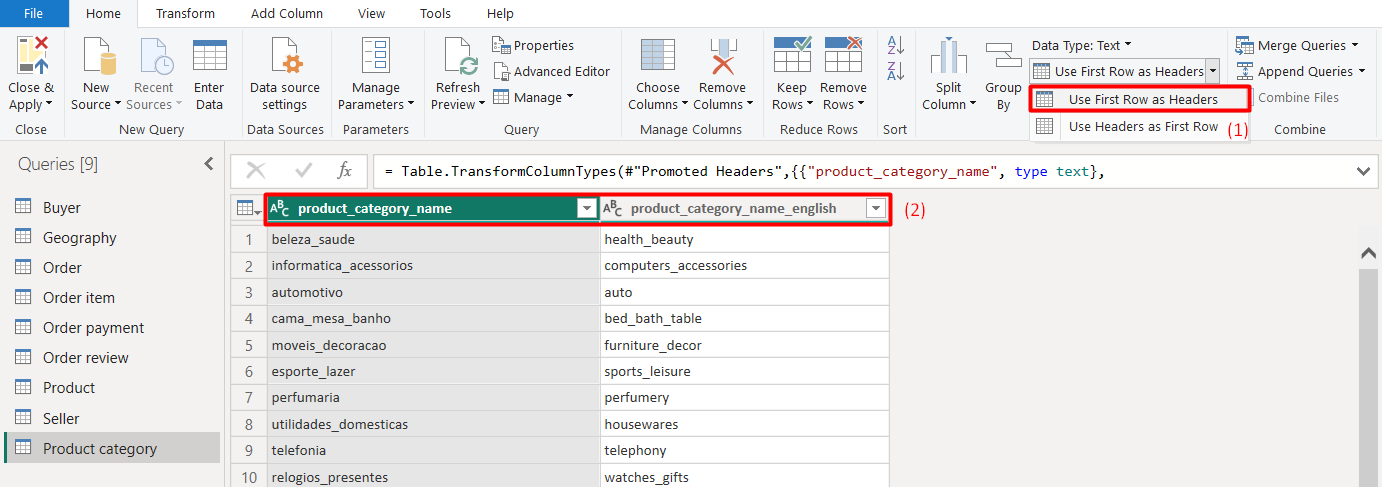 Để làm được điều này, quay trở lại tab Home và lựa chọn “Use First Row as Headers” (1) và bạn sẽ nhận được kết quả như hình dưới đây (2):