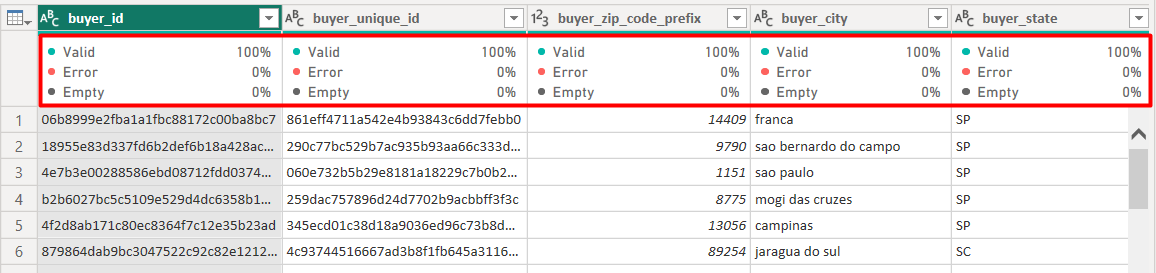 (1) Column quality: Giúp đánh giá chất lượng của dữ liệu: Bao nhiêu % chứa giá trị hợp lệ (Valid), bao nhiêu % chứa giá trị lỗi (Error) và bao nhiêu % số ô trong bảng dữ liệu bị trống (Empty).