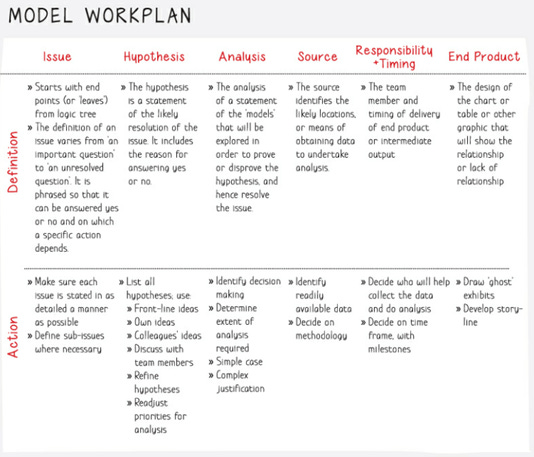 Kế hoạch làm việc là một lộ trình các đầu việc cần thực hiện để đánh giá và phân tích các giả thuyết ban đầu. Kế hoạch cần phân công nhiệm vụ và nguồn lực cụ thể cho từng thành viên trong nhóm.