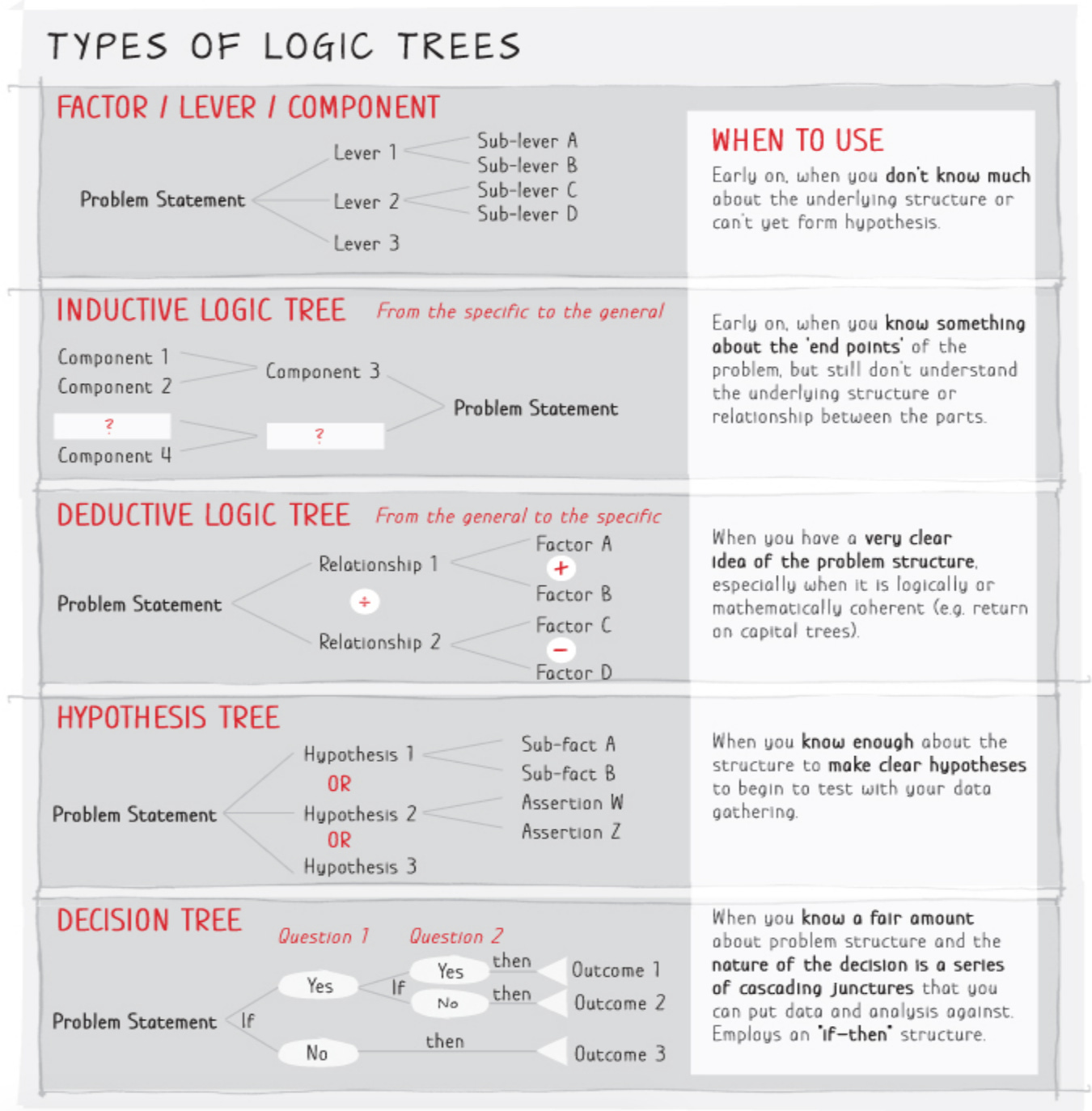 Deductive Logic Tree: Sử dụng để đi từ cái toàn thể đến cái cụ thể, chi tiết (Diễn dịch), thường được dùng khi đã biết rõ về cấu trúc, hệ thống của vấn đề đặc biệt khi nó tự động mạch lạc về mặt logic.