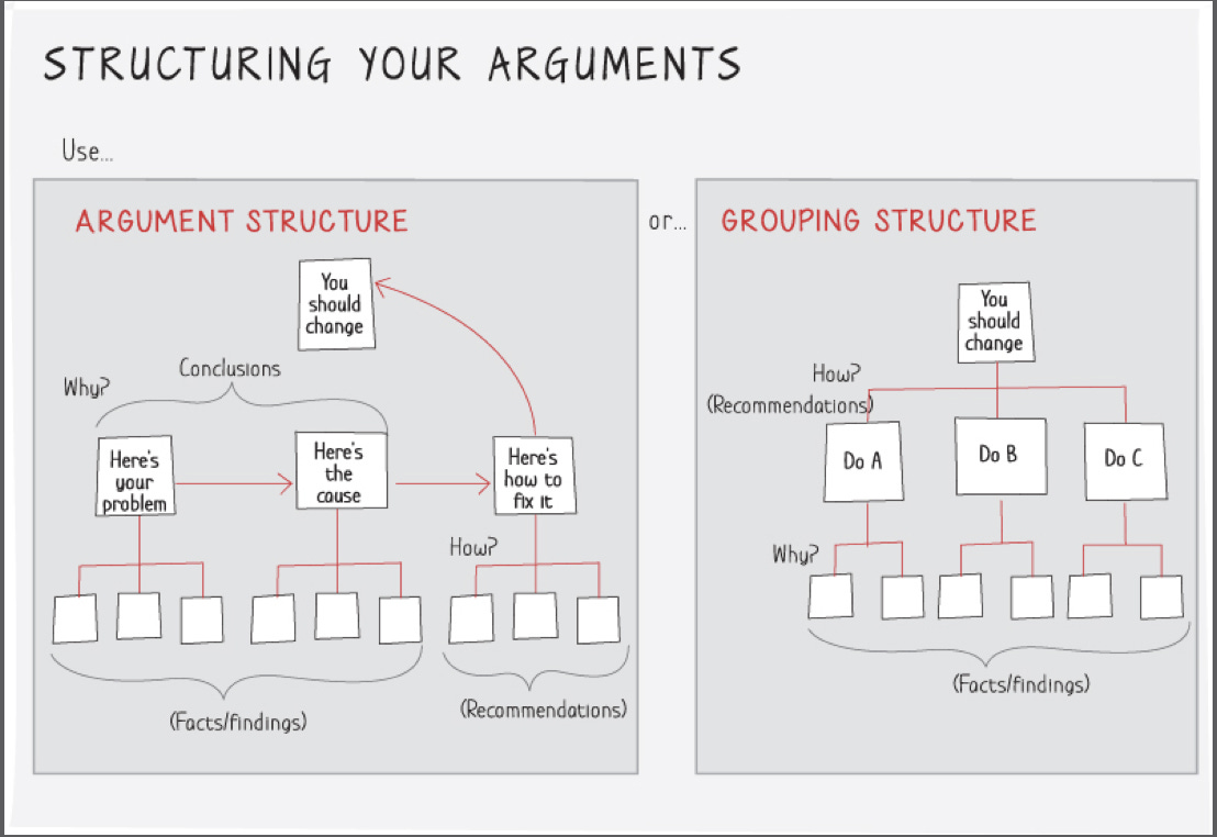 Trình bày theo cấu trúc quy nạp: đi từ thực trạng của vấn đề - nguyên nhân - đề xuất/kết luận, với mỗi phần cần có các luận điểm và dữ liệu lập luận; hoặc ngược lại, trình bày theo diễn dịch: thực trạng các vấn đề - các đề xuất/kết luận - các insight giải thích vì sao đưa ra đề xuất đó. Cách trình bày này tương tự với Decision Tree - nhấn mạnh và giúp người xem nhanh chóng nắm bắt được kết luận và quyết định nên làm gì.