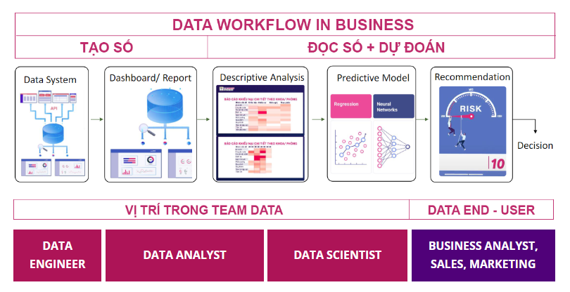 Các khóa học Data tại TM Data School được thiết kế đi theo từng giai đoạn của dòng chảy dữ liệu trong doanh nghiệp, đáp ứng đầy đủ nhu cầu kĩ năng của một Data Analyst: từ “tạo số” đến “đọc số + dự đoán” để tìm ra insight, phục vụ cho quá trình ra quyết định chiến lược. Nhằm cung cấp những kiến thức & kỹ năng cần thiết để học viên có thể tự tin bước ngành data và đảm nhận các vai trò khác nhau trong quy trình làm data trong doanh nghiệp.